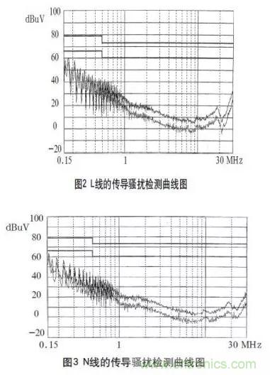 在3m法電波暗室對試驗樣機進行測試,其L、N線的傳導(dǎo)騷擾檢測曲線如圖2、3所示,輻射騷擾的垂直極化掃描曲線如圖4、5所示。