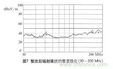 根據(jù)對開關(guān)電源電磁騷擾源的分析可知,在圖1b電路中高頻變壓器T1也是一個騷擾源。為了阻止高頻變壓器產(chǎn)生的騷擾信號以輻射方式發(fā)射,把變壓器的外殼用屏蔽材料銅箔環(huán)繞一圈構(gòu)成一回路加以屏蔽,以切斷變壓器通過空間耦合形成的輻射騷擾傳播途徑。并且為了減少因變壓器一次側(cè)開通時電流瞬間突變產(chǎn)生的di/dt騷擾,在變壓器T1的一次側(cè)串進1個電感,以減小器件的開通損耗,降低輻射騷擾信號。經(jīng)過整改后,輻射騷擾大大下降,再次對本電源輻射騷擾進行測試,完全達到了標(biāo)準(zhǔn)要求,其測試結(jié)果如圖7所示。