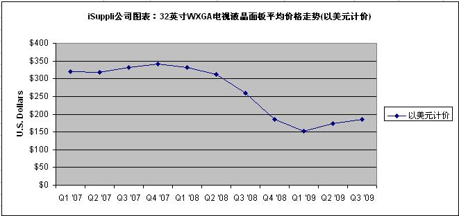 附圖所示為iSuppli公司對于2008年10月至2009年第四季度結束時32英寸WXGA TV LCD面板市場的價格預估。這種面板價格可以體現(xiàn)出整體市場趨勢。
