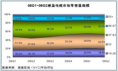受終端售價(jià)快速下降至3000元以內(nèi)及家電下鄉(xiāng)政策因素的拉動,32英寸及以下規(guī)格在LCD零售內(nèi)部比重顯著提升;40/46陣營受42vs40和47vs46均價(jià)傾壓及上游面板廠供銷策略的影響,在一季度銷量比重有所下降,二季度比重有所提升。