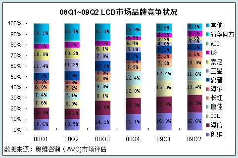 T6陣營(TCL、創(chuàng)維、海爾、海信、長虹、康佳)在2008年,借助“奧運(yùn)攻勢”等活動發(fā)力,并通過產(chǎn)品線的不斷更新定義,終端渠道的投入及價(jià)格戰(zhàn)等逐步確立主導(dǎo)地位。但由于受面板價(jià)格上升及缺貨的影響,2009年二季度國內(nèi)品牌市場地位容易下滑,S3(三星、索尼、夏普)挾技術(shù)及面板資源攻守兼?zhèn)?,同時(shí)LG、冠捷、清華同方品牌也正發(fā)力提升LCD電視市場銷售,市場競爭愈加激烈。