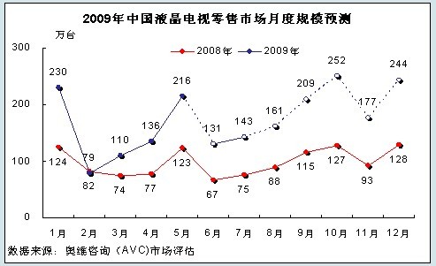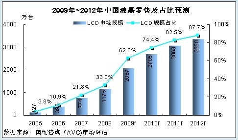 受上半年經(jīng)濟(jì)形勢低迷以及產(chǎn)品替代影響,即使在家電下鄉(xiāng)、節(jié)能補(bǔ)貼、以舊換新三大政策刺激下,2009年全年彩電市場零售量規(guī)模將較2008年下降6.5%。但對于液晶電視來說,則得益于三大政策的刺激,繼續(xù)保持高速增長,預(yù)計(jì)全年LCD電視市場國內(nèi)零售量規(guī)模近2100萬臺,出貨規(guī)模可達(dá)2400萬臺,LCD電視市場將占總體市場比達(dá)到62.6%。