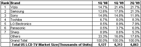 雖然三星奮起直追,但Vizio仍然連續(xù)第二個(gè)季度成為美國液晶電視市場霸主。