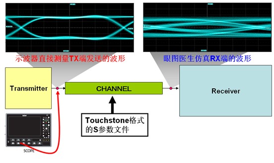 眼圖醫(yī)生(Eye Doctor)是力科于2006年推出的用于高速串行數(shù)字電路設計的強大工具,集成在高帶寬示波器中,包括了虛擬探測(virtual probing)與接收端均衡(receiver equalization)兩部分,主要用于通訊背板設計、高速串行信號一致性測試、高速SERDES芯片均衡器的優(yōu)化與設計等等。在2009年2月,力科發(fā)布了新一代的眼圖醫(yī)生II,提供了更強大的分析能力與良好人機界面。如下圖1所示,利用Eye Doctor的信道仿真功能,可以用示波器測量到的TX端發(fā)送的波形,在Eye Doctor II中導入信道的S參數(shù)模型文件,計算出通過信道后RX端的信號波形、眼圖與抖動,其功能類似于EDA的SI仿真工具。