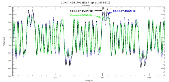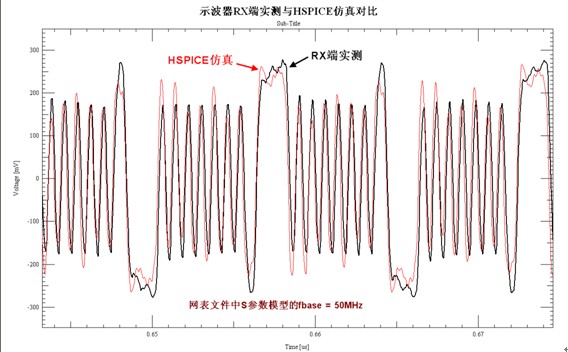 在圖9中分別為fbase=30/40/50MHz時,HSPICE仿真出的接收端波形??梢钥吹絝base=50MHz時,低頻的碼型(長1或長0)幅度較低些,與實測RX端波形的比較接近。在使用HSPICE仿真時,fbase=50MHz時的仿真時間遠小于最開始的頻率設置(fbase = 10MHz)。在圖10中,對比了fbase=50MHz時HSPICE仿真的RX端波形與實測波形,兩者一致性比較好。