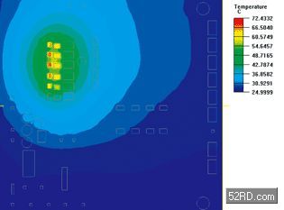 在圖1b中,高溫代表了低的熱導(dǎo)率,低溫代表了高的熱導(dǎo)率。從圖中可以看出,在沒有走線的區(qū)域溫度較高,在走線較多的區(qū)域溫度較低。在有大過孔的區(qū)域,溫度接近45℃。