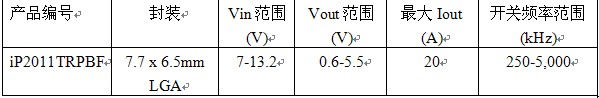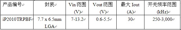 iP2010的輸入電壓范圍為7V至13.2V,輸出電壓范圍則為0.6V至5.5V,輸出電流高達30A。這個器件最高運行頻率為3MHz。在5MHz運行時,與iP2010引腳兼容的iP2011備有相同的輸入和輸出電壓范圍,但后者經(jīng)過優(yōu)化,從而使最高輸出電流高達20A。通過以通用占位面積提供多種電流額定值器件,IR提供的靈活性能夠滿足不同客戶對電流水平、性能和成本的要求。