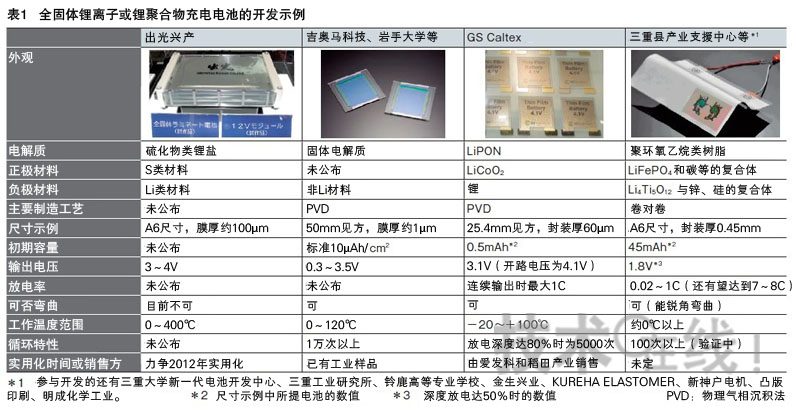 表1:全固體鋰離子或鋰聚合物充電電池的開(kāi)發(fā)示例