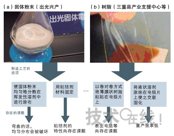 出光興產(chǎn)數(shù)年前就在開(kāi)發(fā)用于固體電解質(zhì)的粉末狀“硫化物類(lèi)鋰鹽”(出光興產(chǎn))的全固體鋰離子充電電池。最近的進(jìn)展主要有兩點(diǎn):①尺寸從名片大小加大到了A6大小,②省去了以前輸出功率時(shí)所需要的數(shù)kgf/cm2壓力。不過(guò),目前還存在彎曲性和電解質(zhì)均一性的課題,需要進(jìn)一步改進(jìn)制造工藝(圖1)。