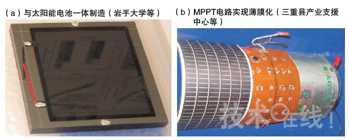 (b)為三重縣產(chǎn)業(yè)支援中心等的開(kāi)發(fā)示例,與太陽(yáng)能面板、最大功率點(diǎn)跟蹤(MPPT)電路,以及鋰聚合物充電電池進(jìn)行了組合。