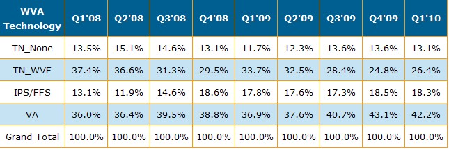 根據(jù)最新發(fā)布的 DisplaySearch Quarterly Wide Viewing Angle Technology Report, (DisplaySearch季度廣視角技術(shù)出貨報告) , VA(Vertical Alignment)型廣視角技術(shù)的面板出貨在所有LCD視角技術(shù)的出貨中取得領(lǐng)先,以出貨面積計算, VA型出貨占了2010年第一季全球所有面板出貨的43.5%(如以下附表所示)。而在各種不同的視角技術(shù)當(dāng)中,VA(Vertical Alignment)型廣視角技術(shù)的面板出貨從2008年第一季的36%持續(xù)成長到2010年第一季的43.5%,目前在面板廠的布局上,LG Display, IPS Alpha 與BOE采取了 IPS (In Plane Switching)與FFS(Fringe-field switching)的技術(shù),其余LCD TV面板生產(chǎn)廠商在32寸及以上的LCD TV面板采用了VA(Vertical Alignment)型廣視角技術(shù)。
