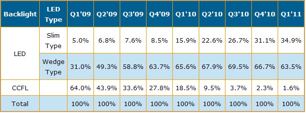 裝載薄型導(dǎo)光板之薄型LED Backlight在筆記本電腦面板市場正快速成長。根據(jù)DisplaySearch最新的Quarterly LED Backlight Panel Shipment and Forecast Report (每季LED Backlight面板出貨與預(yù)測報(bào)告)中指出,筆記本電腦使用的面板當(dāng)中,薄型LED Backlight的比重將由2010年第四季的16%成長到2010年的31%。報(bào)告并指出,LED Backlight在筆記本電腦面板的滲透率由2009年第一季的36%擴(kuò)大到2010年第一季的81.5%,展望到今年年底預(yù)計(jì)滲透率將高達(dá)97.7%;換言之傳統(tǒng)的CCFL Backlight在Notebook PC市場將接近完全退出的狀態(tài)。