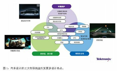 然而,面對日益復(fù)雜的汽車設(shè)計(jì)需求,特別是要推出中高端和商用的新能源汽車之時(shí),自主創(chuàng)新和開發(fā)之路并非坦途。泰克科技的專家曾在不久前舉辦的一場汽車電子技術(shù)論壇上以擁有“100多個(gè)ECU、軟件代碼已經(jīng)達(dá)到700萬行”的豐田L(fēng)exus460汽車為例,強(qiáng)調(diào)了電子部件在汽車特別是高端汽車中所占據(jù)的比例越來越高。“如圖1,汽車電子關(guān)乎目前汽車設(shè)計(jì)的三大市場挑戰(zhàn),即如何滿足生態(tài)(環(huán)境保護(hù))、更舒適方便和增強(qiáng)安全性的要求,而圍繞解決這些挑戰(zhàn)的系統(tǒng)和子系統(tǒng)正是目前汽車電子設(shè)計(jì)的熱點(diǎn)和難點(diǎn)。”他指出。“而局域網(wǎng)、動(dòng)力系統(tǒng)、電子控制單元和數(shù)字RFID的應(yīng)用在改善汽車生態(tài)學(xué)、安全性和舒適性方面扮演了重要的角色。