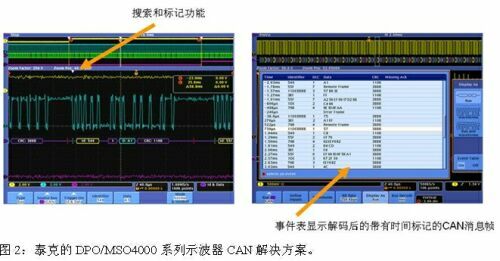對于汽車中常用的CAN、LIN這類低速串行總線的調(diào)試,泰克的DPO/MSO4000系列示波器提供了簡單、易用、完整、高品質(zhì)的觸發(fā)、捕獲和解碼解決方案。如圖2,該示波器系列提供了搜索和標(biāo)記功能,可在事件表顯示解碼后的帶有時(shí)間標(biāo)記的CAN消息幀,這一功能是其他競爭性產(chǎn)品所不具備的。