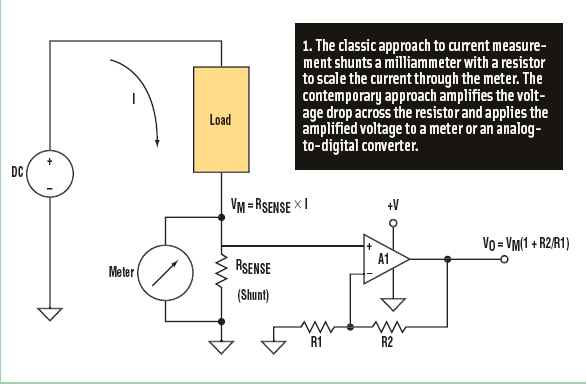 圖1:通過電路進(jìn)行電流測(cè)量的最常用方法是測(cè)量一個(gè)低值電阻兩端的電壓降。