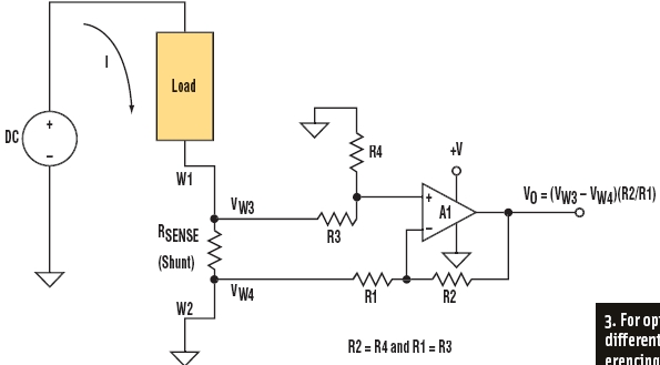 為避免引入這樣的誤差,需要進(jìn)一步增加兩個(gè)措施:采用開爾文連接方式與分流電阻相連并加入一個(gè)差分輸入放大器。開爾文連接是一種帶有兩條激勵(lì)引線和兩條傳感引線的4線連接(圖2)。其中兩條線(W1和W2)是激勵(lì)引線,它們將分流電阻連接到該電路的大電流端。另外兩條線(W3和W4)為傳感引線,它們將分流電阻兩端的電壓連接到放大器。這個(gè)方式將攜帶負(fù)載電流的導(dǎo)線與測(cè)量電路分離開來(lái),并把W1和W2中的電壓降從分流電阻兩端的電壓測(cè)量中清除。為了進(jìn)一步有效利用開爾文連接的優(yōu)點(diǎn),還需加入一個(gè)差分放大器(如圖3)。