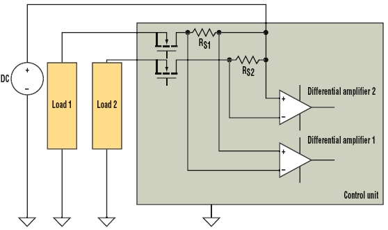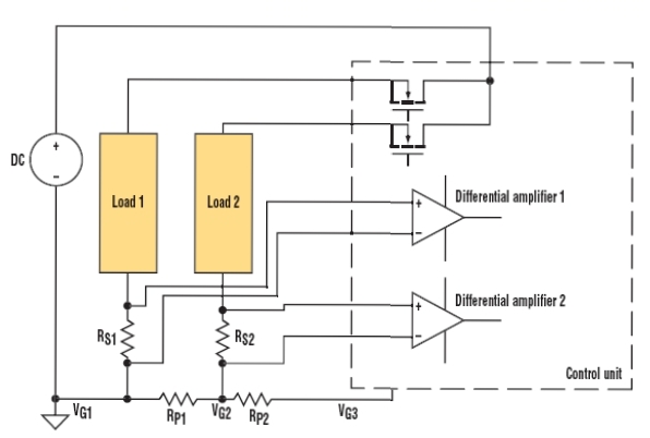 由于低端測(cè)量例子可能產(chǎn)生共模問題,這里考慮圖4所示的分布負(fù)載系統(tǒng)。虛線框中的控制單元使用MOSFET來(lái)控制輸送到兩個(gè)負(fù)載的功率。電源、負(fù)載和控制單元之間的寄生電阻RP1和RP2代表接地引線電阻和連接器電阻之和。在實(shí)際電路中,它們的數(shù)值可能為幾百毫歐。對(duì)于這個(gè)例子,假設(shè)RP1和RP2為0.2 Ω。差分放大器1和2與圖3中的差分放大器類似。