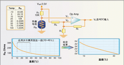 有時需要對熱敏電阻的輸入進行標定以便得到合適的溫度分辨率,圖3是一個將10~40℃溫度范圍擴展到ADC整個0~5V輸入?yún)^(qū)間的電路。運算放大器輸出公式如下: