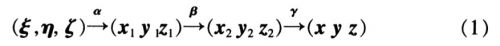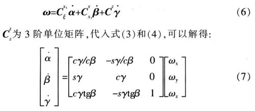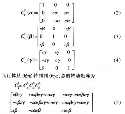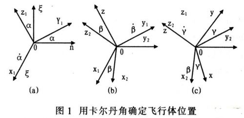 在對(duì)剛體的轉(zhuǎn)動(dòng)運(yùn)動(dòng)進(jìn)行解析描述時(shí).常應(yīng)用歐拉角或卡爾丹角。卡爾丹角適用于姿態(tài)角變化較小的場(chǎng)合,因此.用卡爾丹角進(jìn)行描述。取初始時(shí)刻飛行體坐標(biāo)系Oξηζ為固定坐標(biāo)系,0xyz為與飛行體固結(jié)的動(dòng)坐標(biāo)系??柕そ沁x取的方法是,首先繞ξ軸轉(zhuǎn)過(guò)α角,到達(dá)0x1y1zl的位置;再繞y1軸轉(zhuǎn)動(dòng)β角,到達(dá)0x2y2z2的位置;再繞z2軸轉(zhuǎn)動(dòng)γ角,到達(dá)0xyz的位置。轉(zhuǎn)動(dòng)關(guān)系如圖l所示。