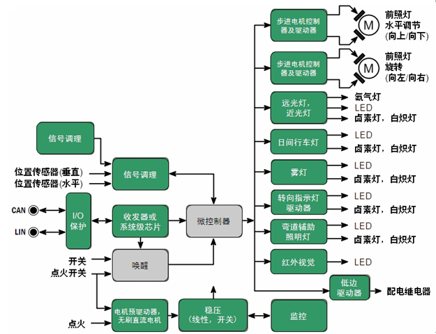 圖1:安森美半導(dǎo)體汽車前照燈方案(見深綠色背景框)