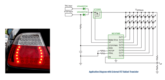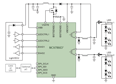 NCV7680可以作為一個(gè)獨(dú)立器件,也可以作為配合復(fù)雜系統(tǒng)的額外支持電路。結(jié)合升壓控制器運(yùn)行時(shí),額外LED可連接為一個(gè)LED串。其典型應(yīng)用包括組合尾燈、日間行車燈(DRL)、霧燈、中央高位剎車燈(CHMSL)陣列、轉(zhuǎn)向指示燈和其他外部調(diào)制應(yīng)用、液晶顯示器(LCD)背光等。