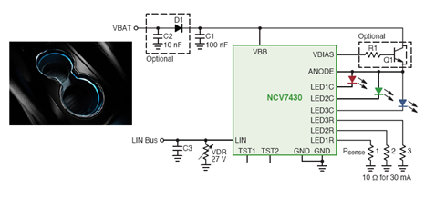 安森美半導(dǎo)體的NCV7430 LIN RGB LED驅(qū)動(dòng)器結(jié)合了LIN收發(fā)器與RGB LED驅(qū)動(dòng)器和內(nèi)存。它是一個(gè)單芯片RGB驅(qū)動(dòng)器,旨在監(jiān)測汽車內(nèi)部照明中的專用多色LED應(yīng)用。它包含LED顏色和亮度參數(shù)編程的LIN接口(從設(shè)備)。器件通過LIN總線接收指令,隨后獨(dú)立驅(qū)動(dòng)LED。