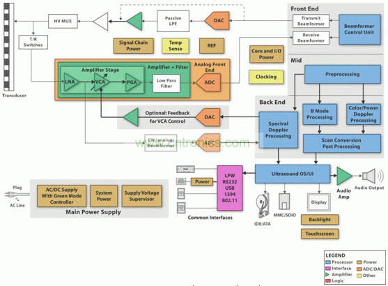 超聲波系統(tǒng)因其功能和性能不同而各異。例如,3D、4D 和諧波成像模式通常被用于高端系統(tǒng),而只有 2D B-模式成像和頻譜多普勒可能被用于一些低端系統(tǒng)。功能差異主要取決于數(shù)字后端。高 端超聲波系統(tǒng)要求更多和更快的計算能力,其需要具有接近實時信號處理的高端 DSP。很明顯,在高端便攜式系統(tǒng)之間實現(xiàn)共享信號處理單元是非常困難的。但是,在不考慮不同性能要求的情況 下,超聲波系統(tǒng)通常擁有相似的接收通道架構(gòu)。