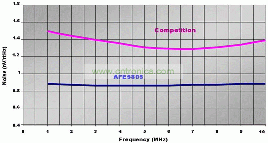 為了滿足上述標(biāo)準(zhǔn),我們需要一個超聲波 AFE(例如 TI 的 AFE5805)。最為先進(jìn)的 BiCMOS 和 CMOS 技術(shù)用于對功耗和噪聲性能進(jìn)行優(yōu)化。由于其低功耗、小芯片尺寸以及較低的閃爍噪聲, BiCMOS 工藝是 AFE5805 VCA 部分的理想之選。CMOS 工藝非常適用于模數(shù)轉(zhuǎn)換器。與同類解決方案相比,這些綜合的創(chuàng)新使尺寸縮小了 50%,功耗降低了 20%,噪聲減少了 40%。圖 2 所示的恒 定噪聲性能涵蓋了整個工作頻率范圍。因此,我們設(shè)計的便攜式超聲波系統(tǒng),可以實現(xiàn)卓越的圖像質(zhì)量以及最低的功耗。