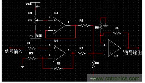 開關(guān)CD4051來連接不同的電阻,不同的R1,R2通過公式:這樣就可以實(shí)現(xiàn)程控放大功能了??烧{(diào)電阻R9用來設(shè)置信號(hào)調(diào)理電路加入的直流分量的大小。放大后的信號(hào)和直流分量最后由U3模擬加法器疊加后輸出。