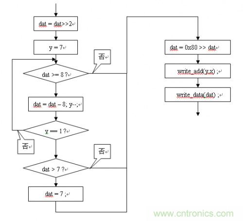 LCD的縱向分為8個(gè)地址從上到下依次為0~7,每個(gè)地址段有8個(gè)數(shù)據(jù)點(diǎn)。在某個(gè)數(shù)據(jù)段中如果想依次讓這些位從上到下點(diǎn)亮就需要依次向這個(gè)地址段送數(shù)據(jù)0x01,0x02,0x04,0x08,0x10,0x20,0x40,0x80,送入0x00后這個(gè)地址段的8個(gè)數(shù)據(jù)點(diǎn)將不被點(diǎn)亮。實(shí)現(xiàn)的具體過程如圖4所示。