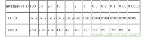 ADC的采樣頻率在上文已有提及,ADC中斷的計(jì)算公式為:,通過ATmega16的特殊功能寄存器TCCR0的低3位CS02,CS01,CS00的設(shè)置就可以改變的頻率,再把TCNT0設(shè)置成不同的數(shù)值就可以得到這個(gè)系統(tǒng)所需要的各個(gè)采樣頻率值了。表1中的數(shù)據(jù)是通過上面的公式計(jì)算出來的數(shù)據(jù)再經(jīng)實(shí)際的系統(tǒng)調(diào)試并修正后的數(shù)據(jù)。