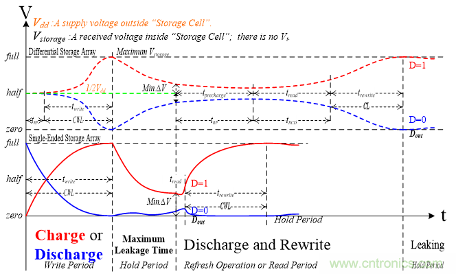 如果說(shuō)3T DRAM是第一代DRAM技術(shù),使用差動(dòng)放大器實(shí)現(xiàn)讀取功能的1T DRAM是第二代DRAM,那么在本文中的第三代DRAM技術(shù)是指取代差動(dòng)放大器且大幅提升讀取功能的存取技術(shù)。1T DRAM的內(nèi)存基本單位是由一晶體管和一電容器所組成的儲(chǔ)存單元,又稱為1T DRAM單元。圖3顯示在單一儲(chǔ)存單元上進(jìn)行存取操作的波形,上半部分是使用差動(dòng)放大器的第二代技術(shù),下半部分是第三代技術(shù),此圖主要用于比較這二者完成讀取操作所需花費(fèi)的最長(zhǎng)時(shí)間。當(dāng)這一電容器的儲(chǔ)存電壓(Vstorage)放電達(dá)到最小差異電壓(Min. ?V)時(shí)就必須立即進(jìn)行更新操作(即讀取),所以此圖呈現(xiàn)有關(guān)讀取操作的最長(zhǎng)時(shí)間就等于是更新操作的最長(zhǎng)時(shí)間。圖中標(biāo)示有tprecharge、tread、trewrite、twrite,這些技術(shù)用語(yǔ)依序?qū)?yīng)產(chǎn)品規(guī)格的tRP、tRCD、CL與CWL。第三代技術(shù)無(wú)需tRP,除此之外,tRCD也很短暫且可由CWL替換CL,因此訪問速度接近SRAM,存取效率低于SRAM。