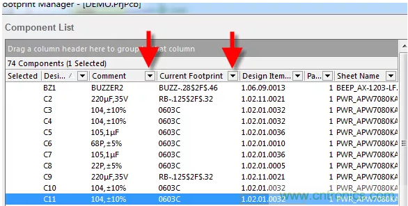 2、如圖1-2可見,原理圖中涉及到的元器件都在“Component List”里面進(jìn)行了顯示,點(diǎn)擊“Current Footprint”,可對同類型的封裝進(jìn)行集中排序,方便我們設(shè)計(jì)者按照封裝庫類去檢查封裝的完整性,若某個器件沒有添加封裝,會優(yōu)先在前排顯示處理。