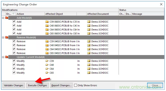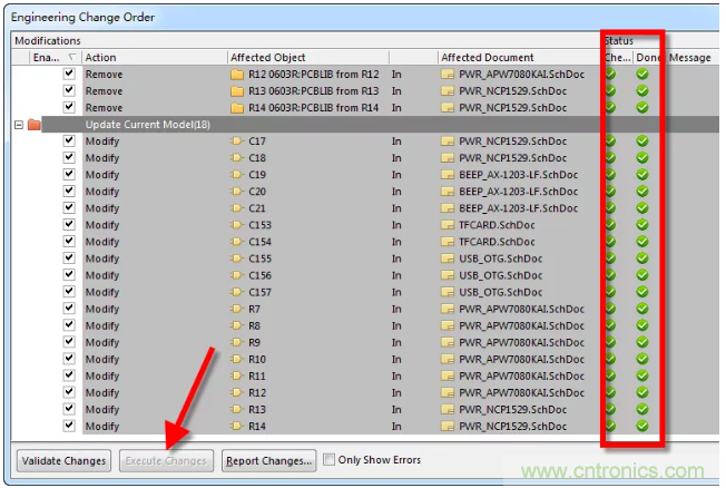 4、對封裝進(jìn)行完編輯或添加等操作之后,執(zhí)行右下角的“Accept Changes(Create ECO)”命令,對更新內(nèi)容點(diǎn)擊“Execute Changes”更新到原理圖當(dāng)中,如圖1-4。