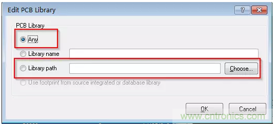 3、執(zhí)行菜單命令“Tools-Footprint Manager”打開封裝庫管理器,如圖1-7所示,全選左框中所有器件和右框中所有封裝名,在右框中右擊,選擇下拉菜單中“Change PCB Library”按鈕,在匹配路徑對話框中選擇“Any”匹配項(xiàng),可以實(shí)現(xiàn)工程目錄下多個PCB庫的任意匹配,或可以選擇“Library Path”,選擇指定的路徑,如圖1-8所示。