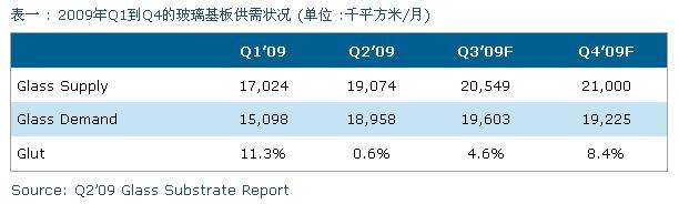 - 在2009年第二季玻璃的供給大于需求比率僅有0.6%