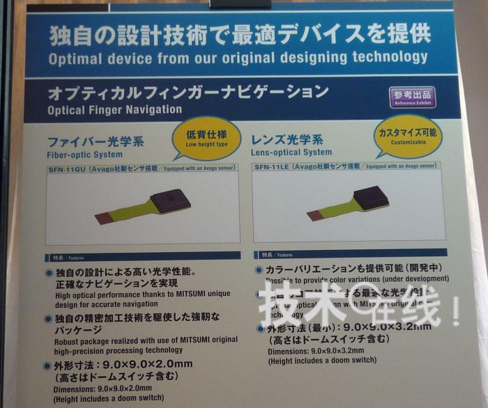 三美電機開發(fā)出了厚度僅為2mm的光學式輸入傳感器模塊“SFN-11GU”。設想用于用一根拇指在手機畫面上進行操作的用途。解說員表示,“如果是觸摸面板的話,大多數(shù)情況下需要一手拿著手機,用另一只手的手指碰觸畫面進行操作,而有些顧客希望可以只用單手進行操作”。該產品已經用于便攜終端產品中。