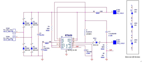 此外,RT8450升降壓架構(gòu)在LED驅(qū)動(dòng)電路不受輸入電壓變動(dòng)影響的特性,可支持前級(jí)電路實(shí)現(xiàn)三端雙向可控硅(TRIAC)調(diào)光方案,因?yàn)檫@款芯片可利用將TRIAC的截波轉(zhuǎn)為PWM訊號(hào)后控制RT8450線性亮度調(diào)節(jié)的接腳,可以調(diào)控整體照明方案亮度明暗變化,而且不會(huì)出現(xiàn)閃爍情況。