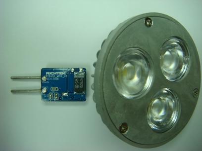 此外RT8450采用了非常小的WDFN封裝并具有4.5-40V輸入電壓范圍,這使得RT8450的驅(qū)動(dòng)電路能提供很寬的驅(qū)動(dòng)電壓范圍及輸入保護(hù)。RT8450的工作溫度高達(dá)125℃,可以在MR16燈具內(nèi)的高溫環(huán)境中安全地工作。其500kHz的開關(guān)頻率使驅(qū)動(dòng)電路可以采用小尺寸的電感和電容,另外升降壓電路架構(gòu)可以將輸入濾波電容容值降低,這樣便可以將驅(qū)動(dòng)電路放置在MR16燈具中,如圖2所示。