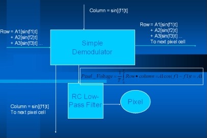 每個(gè)行列訊號(hào)的交叉點(diǎn)映射每個(gè)畫(huà)素的頻率控制(每列訊號(hào)具有相同的頻率,但每行訊號(hào)的頻率不同)。每個(gè)畫(huà)素包含一個(gè)簡(jiǎn)單的解調(diào)電路,能夠解調(diào)輸入的行列訊號(hào),而產(chǎn)生一個(gè)可控制畫(huà)素亮度的訊號(hào)振幅(圖2)。如此一來(lái),所有的畫(huà)素就能夠同時(shí)加以控制,并且表現(xiàn)出不同的亮度。