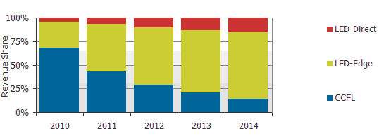 DisplaySearch預估2010年LED背光液晶電視將占所有液晶電視出貨的20%,大約90%的LED背光液晶電視是使用側(cè)光式背光源。在2011年由于LED零組件供應補足且價格下滑,LED背光液晶電視將在2012年成為主要的應用技術(shù)。隨著節(jié)能觀念提高與相關(guān)規(guī)定出臺,以及輕薄設(shè)計流行,CCFL到LED背光源液晶電視轉(zhuǎn)換速度將非常快速。