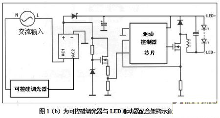 所以它是LED照明常用方法,見圖1(b)所示可控硅調(diào)光器與LED驅(qū)動器配合架構(gòu)示意。