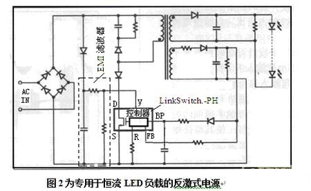 應該說如今有多種類型控制器可以構(gòu)建恒流LED驅(qū)動電源-LED負載的反激式電源。在此僅以集成多項控制器LinkSwitch.-PH構(gòu)建的LED驅(qū)動器為例作分析。