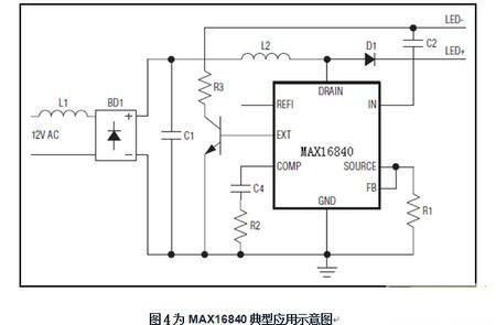 MAX16840具有的應用特征是LED換代燈構(gòu)建技術(shù)的保證。MAX16840 集成MOSFET LED驅(qū)動器,可用于MR16及其它12V交流輸入燈。它采用獨特的技術(shù)控制燈管的輸入電流,對輸入電流進行整形,可使用大多數(shù)電子變壓器和調(diào)光器支持無閃爍工作,很好地解決了上述“問題的提出”之困擾。