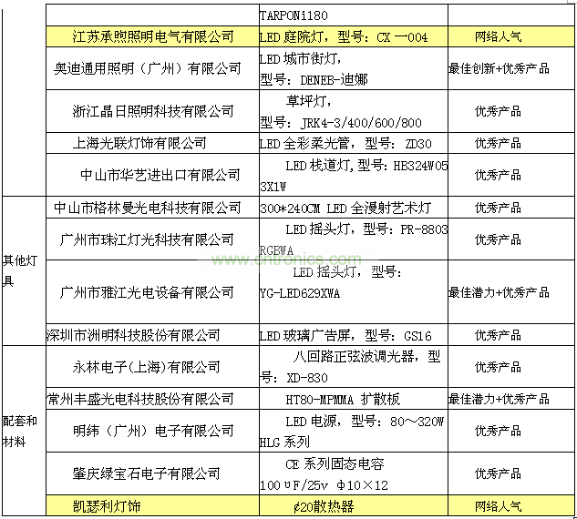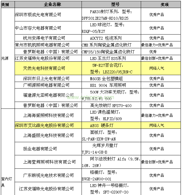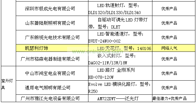 2012年6月9日,2012廣州國際照明展覽會開幕當(dāng)天,主辦方組織20名終審專家對終審會議評選出來的獲獎候選產(chǎn)品進行現(xiàn)場的考核評審,最終確定35個優(yōu)秀產(chǎn)品獎,3個最佳創(chuàng)新獎、5個最佳潛力獎的獲獎名單;5個最佳網(wǎng)絡(luò)人氣獎是由網(wǎng)友海選出來的名單。
