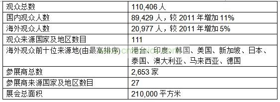 第十七屆「廣州國際照明展覽會」展覽面積達21萬平方米,規(guī)模較2011年增長5%,參展企業(yè)2653家,比上屆減少9%,參展企業(yè)來自全球27個國家和地區(qū)。本屆展會觀眾數(shù)目同創(chuàng)新高,吸引了110,406名觀眾,較2011年增長10%,分別來自111個國家及地區(qū),其中國內(nèi)專業(yè)觀眾89,429人,較2011年增加11%,海外專業(yè)觀眾20,977人,較2011年增加5%,海外觀眾前十位來源地分別是港澳臺地區(qū)、印度、韓國、美國、新加坡、日本、泰國、澳大利亞、馬來西亞和德國。大會同期舉辦的各類技術研討會、產(chǎn)業(yè)高峰論壇、產(chǎn)品推介會、交易節(jié)等高水平會議、論壇交流活動多達110多場次,較去年增加10場,亦創(chuàng)新高。