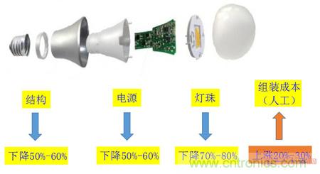 從上圖表示,LED光源產(chǎn)品無論是從結(jié)構(gòu),電源還是燈珠,成本都有大幅下降至少50%,然而人工組裝成本卻漲幅近20%-30%。晶豐明源銷售總監(jiān)李寧在第六屆華強(qiáng)國際LED照明市場戰(zhàn)略暨創(chuàng)新技術(shù)研討會(huì)上表示:“晶豐明源將持續(xù)提供更高性價(jià)比的整體電源方案來提高客戶的競爭力,其次,實(shí)現(xiàn)全自動(dòng)化生產(chǎn),提高效率,從而幫助客戶降低人工成本。”