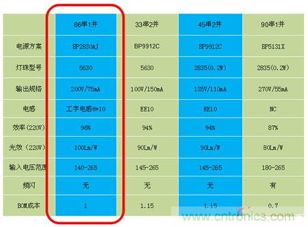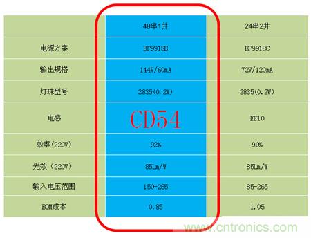 從上圖各種參數(shù)對比我們可以看出,單從成本來看,一定是線性方案最低,但同時(shí)會(huì)存在一些問題,比如光效,效率并不是很理想,最關(guān)鍵的一點(diǎn),線性方案溫度較高,因?yàn)殇X基板溫度高而造成的硫化而存在一定的風(fēng)險(xiǎn)。所以,從整體參數(shù)對比來看,66串1并的方案是性價(jià)比最高的。同理,8W T管方案推薦的是單串1并BP9918B的方案,單片集成工藝,集成啟動(dòng)電阻,極簡的外圍電路,系統(tǒng)成本極具競爭力,其中值的一提的是該方案采用了CD54電感,可將BOM成本可以做到大概在0.85左右,且可以實(shí)現(xiàn)全貼片的方案,從而幫助客戶降低人工成本。