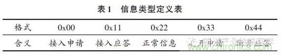 以容量為10人的紫外光語(yǔ)音通信系統(tǒng)為例說(shuō)明數(shù)據(jù)幀結(jié)構(gòu)的設(shè)計(jì)??紤]到通常情況下人講話的語(yǔ)速為每分鐘160~180個(gè)漢字,在保留一定余量的情況下,假設(shè)每分鐘240個(gè)漢字,如果壓縮后的語(yǔ)音信號(hào)速率為4.8Kb/s,可以算出平均每個(gè)漢字時(shí)間內(nèi)的比特?cái)?shù)為1200b。據(jù)此設(shè)計(jì)的數(shù)據(jù)幀結(jié)構(gòu)如圖3所示,其中數(shù)據(jù)的信息速率為60Kb/s,信息體長(zhǎng)度為1200b,時(shí)隙頭長(zhǎng)度為96b。時(shí)隙頭包括前導(dǎo)序列、信息類型、發(fā)送方代號(hào)和接收方代號(hào),長(zhǎng)度分別為72b,8b,8b和8b。每一個(gè)用戶只處理接收代號(hào)和自己的代號(hào)一致的時(shí)隙。收發(fā)雙方作為一個(gè)組合占用相鄰的兩個(gè)時(shí)隙。前導(dǎo)序列為0,1交替的序列,信息類型的定義如表1所示。