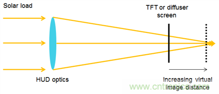 圖 2:HUD光學(xué)器件將太陽能負載放大到散射屏或薄膜晶體管(TFT)面板上